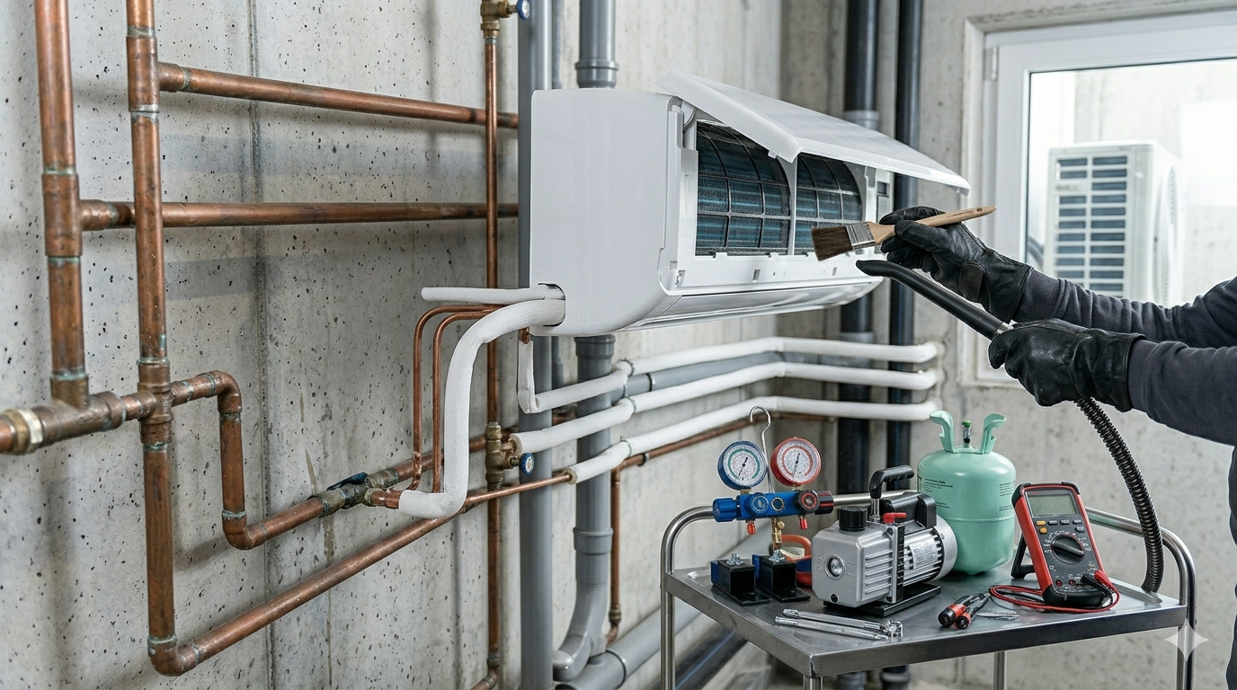 Druckprüfung, Vakuumierung, Kältemittelbefüllung, Funktionstest. Abschließend erklären wir die Steuerung per App und die Wartungsintervalle.